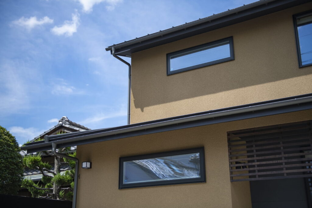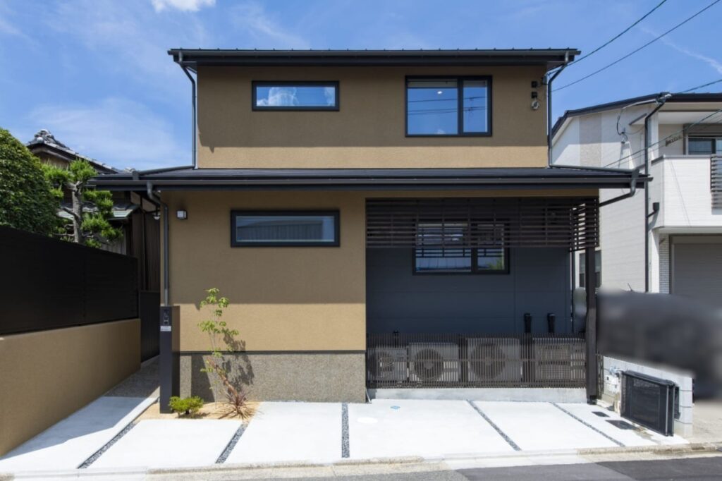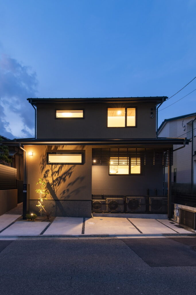 京都市北区の中高層住居専用地区における新築事例です。敷地は南面道路に面しているため、玄関を建物側面に配置しプライバシーを確保しました。南面に設けた窓は採光を確保しながらも、隣家や道路からの目線が届きにくいよう位置を調整し、庇や格子でカバーしています。