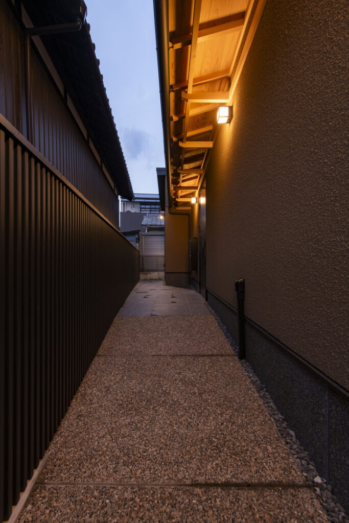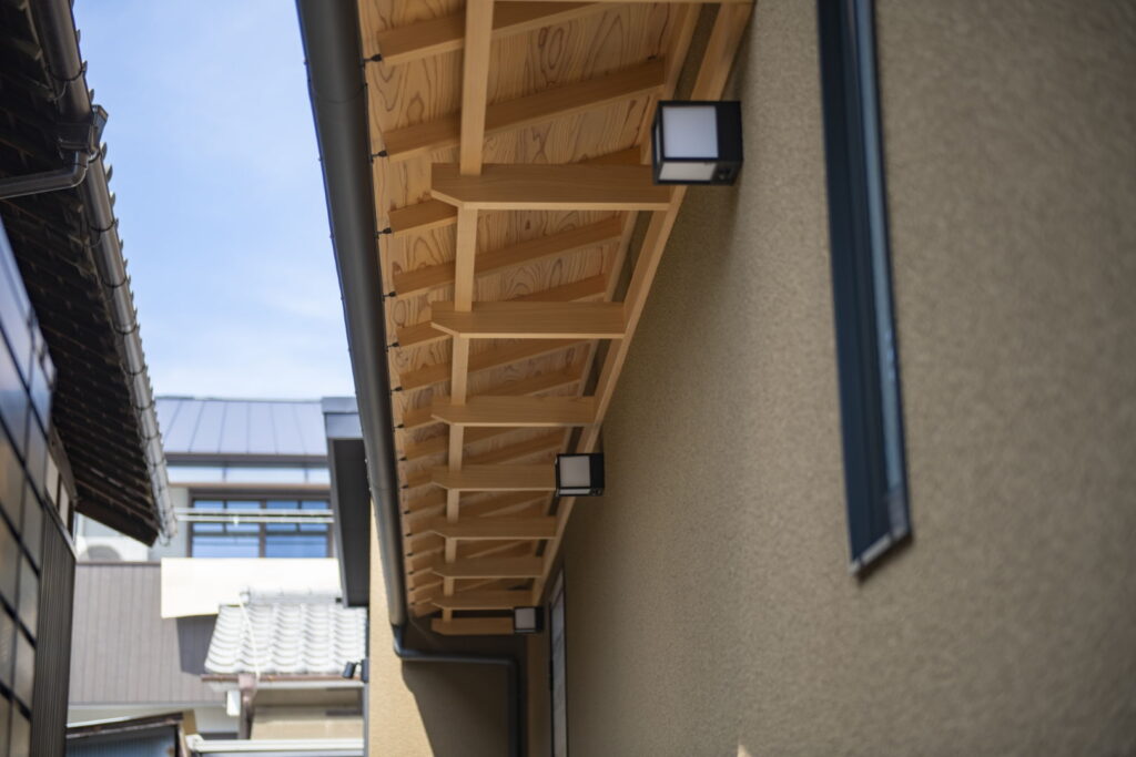 玄関に続くアプローチは化粧軒天を採用、高級旅館のような趣きある仕上がりになりました。