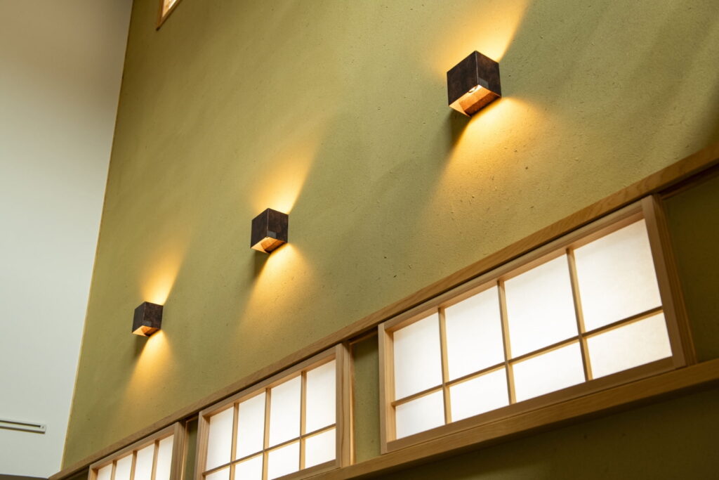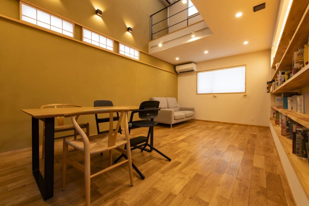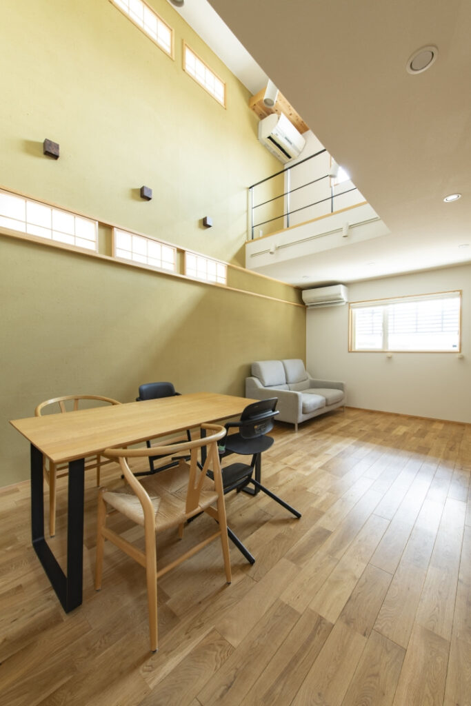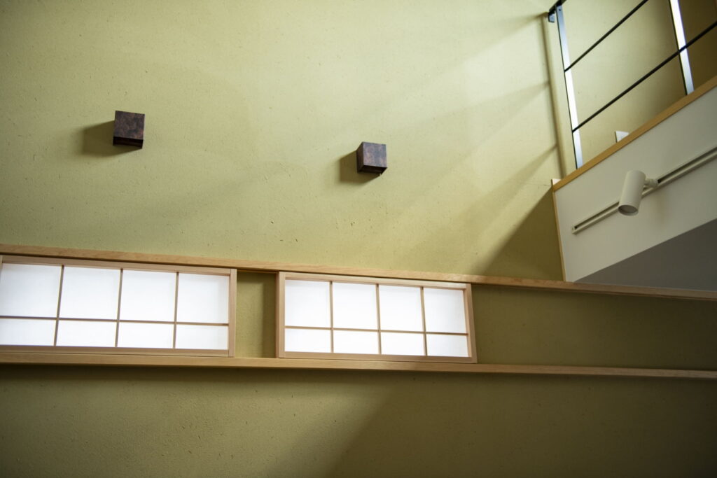 吹き抜け壁は一面左官仕上げに、窓には障子を配置しました。