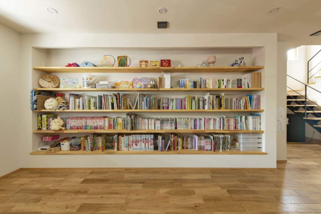 本を沢山読んでほしいというご両親の思いで作った壁面本棚。ここにある本を、お子さん達が自然に手に取り読むようになったそうです。