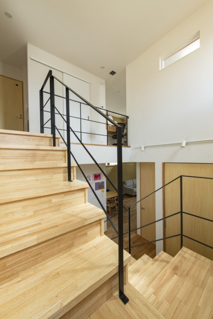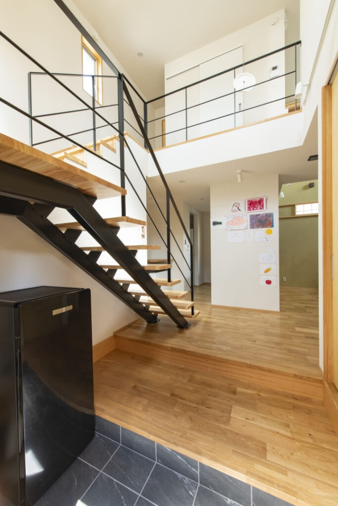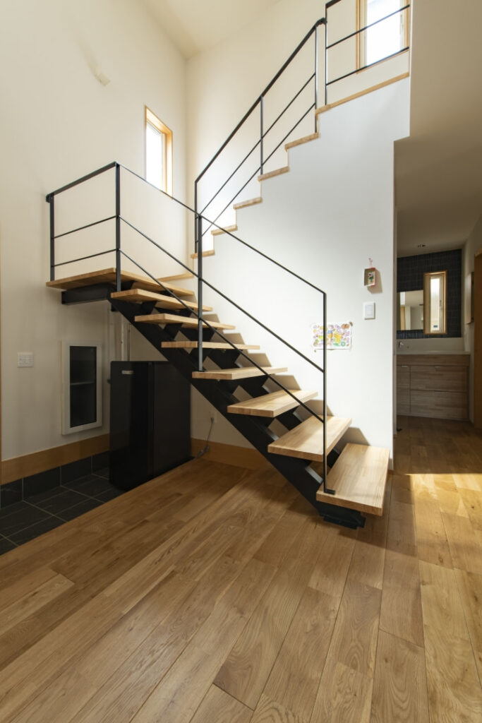 玄関を入ったところにある吹抜けの階段が、この家を訪れた人を印象的に迎えてくれます。