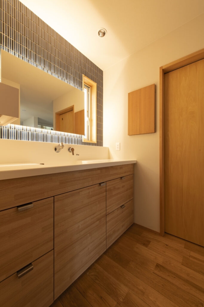 背の高いご夫婦に合わせて、洗面所は造作で既製品よりも高さを上げて作りました。