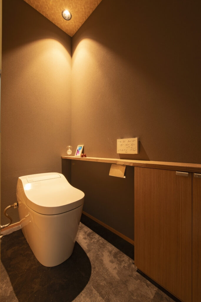 落ち着いた雰囲気のトイレはカウンター付きの造作家具で掃除道具などもスッキリ収納