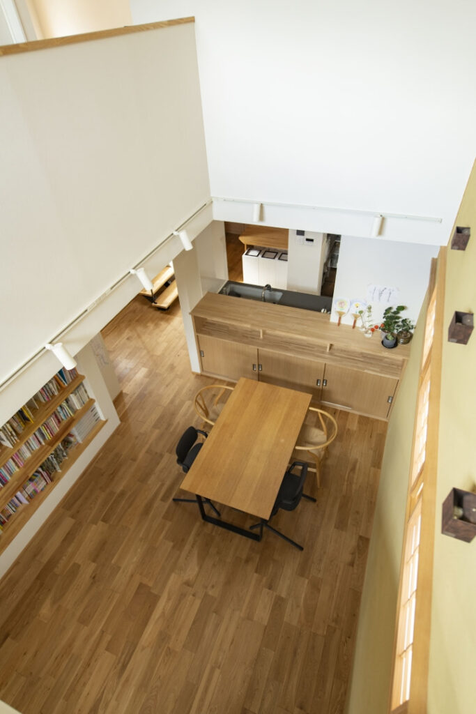 この住まいの中心となる壁面本棚のあるリビングは吹き抜けとし、圧迫感を感じさせない開放的な空間に仕上げました。また、お施主様の「ふとした瞬間に空が見えるように」というご要望に応え、視線の先に空が抜ける窓を計画。明るさと心地よさを実現しています。