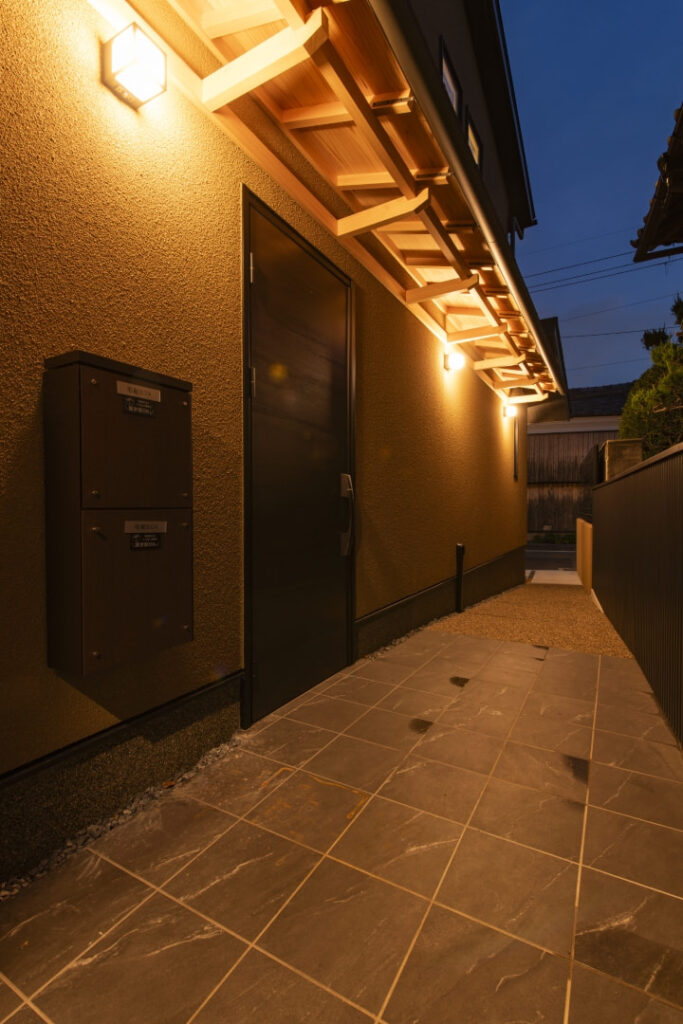 玄関まで和風のブラケットが優しくアプローチを照らして、家族の帰りを待っています。